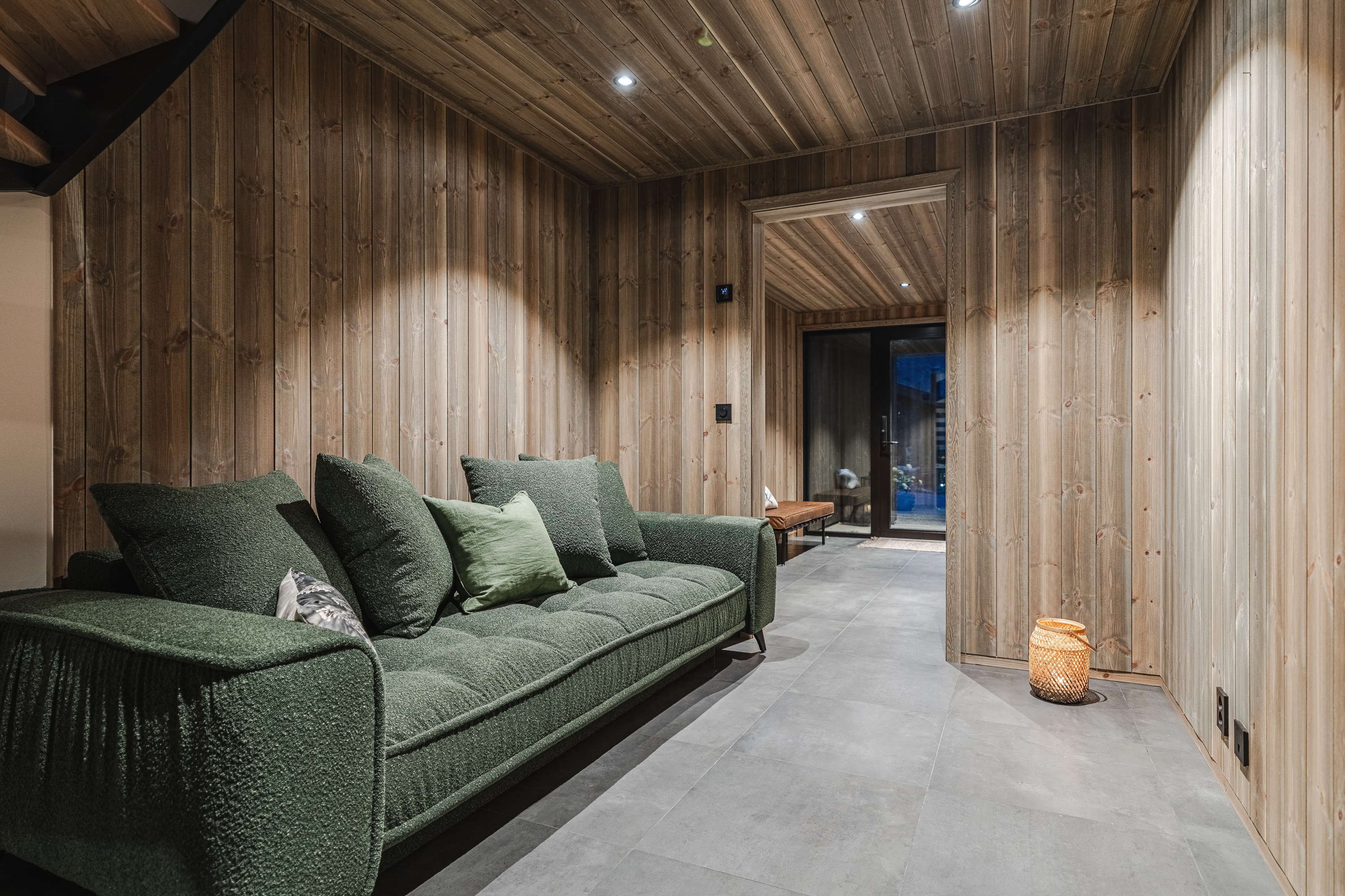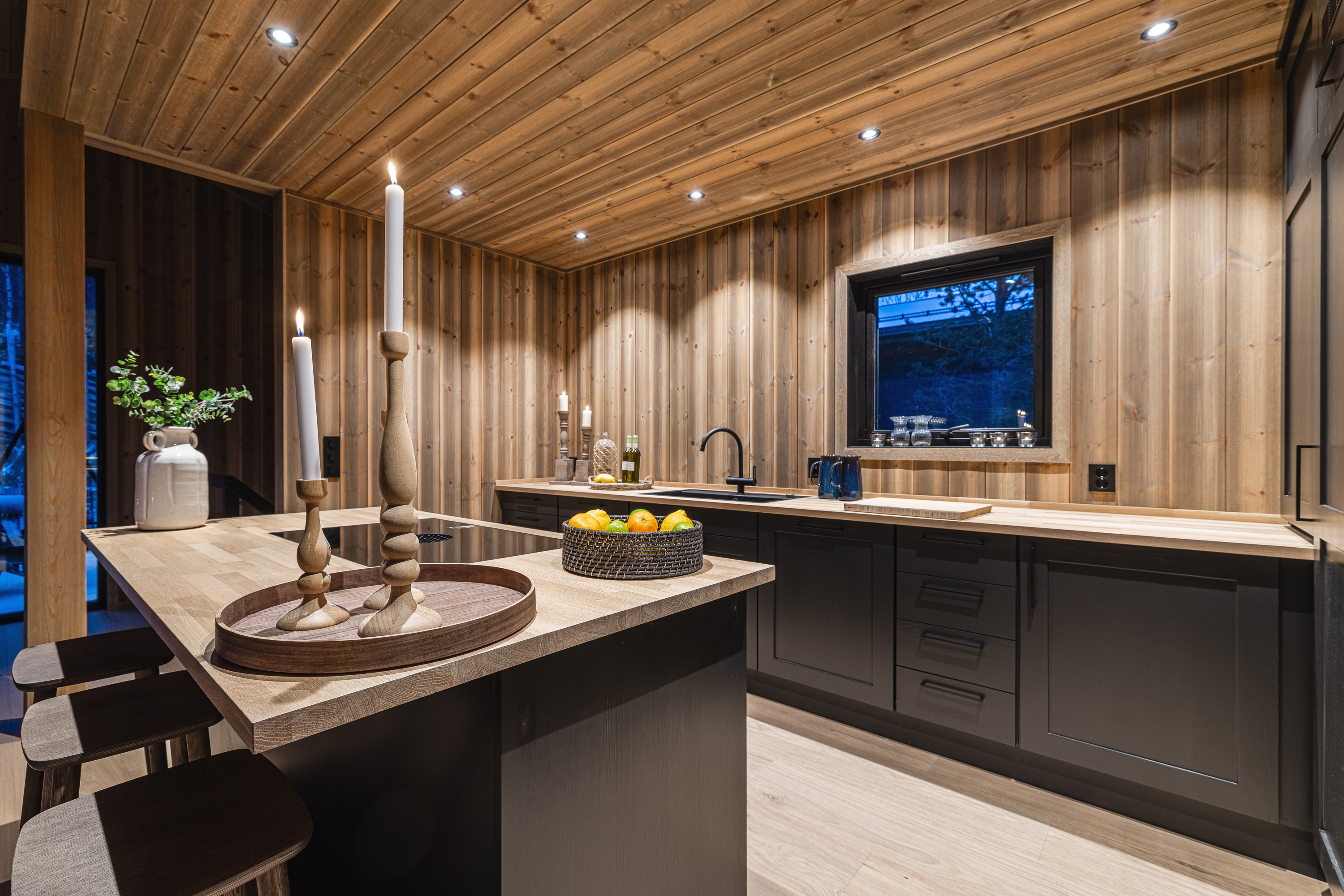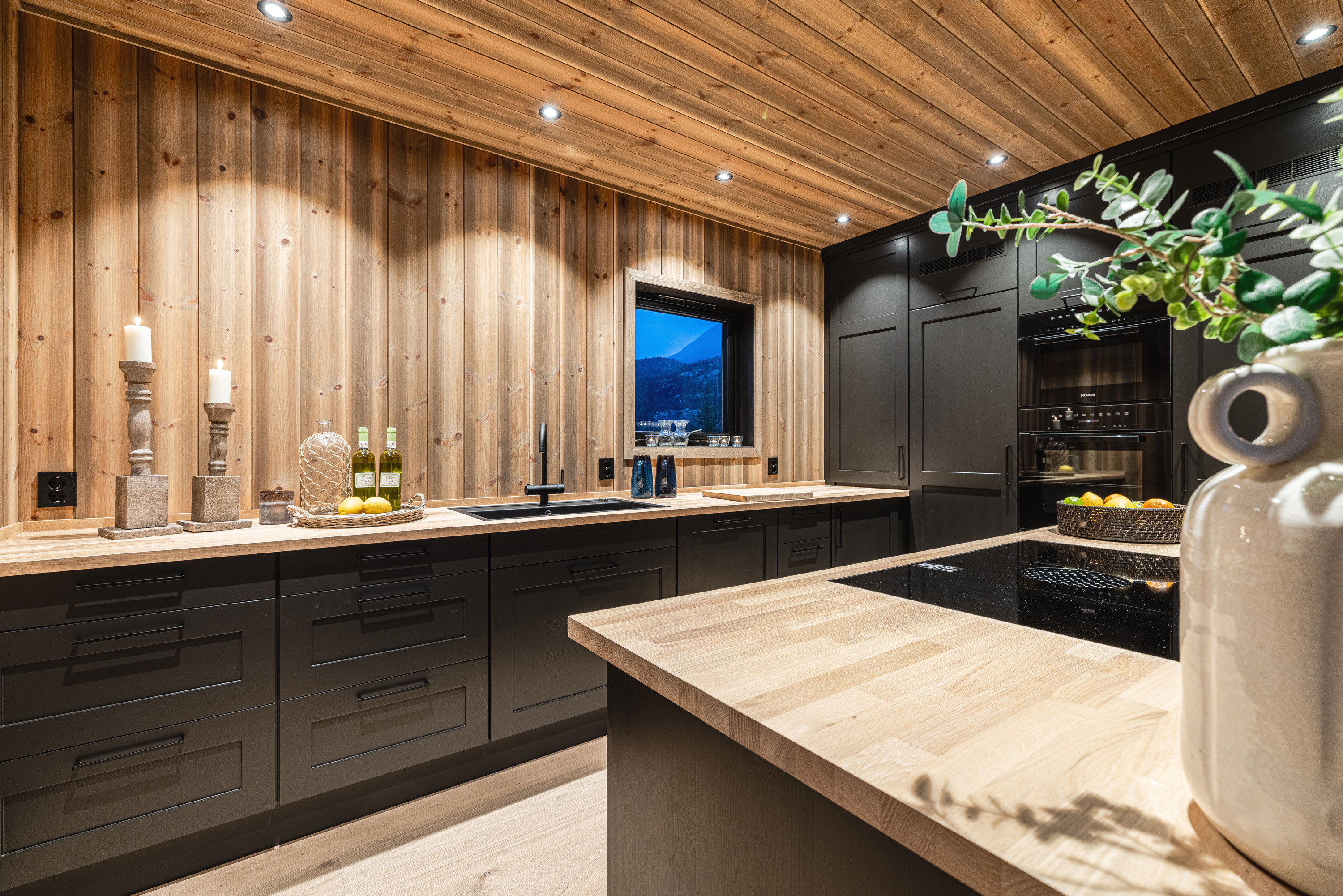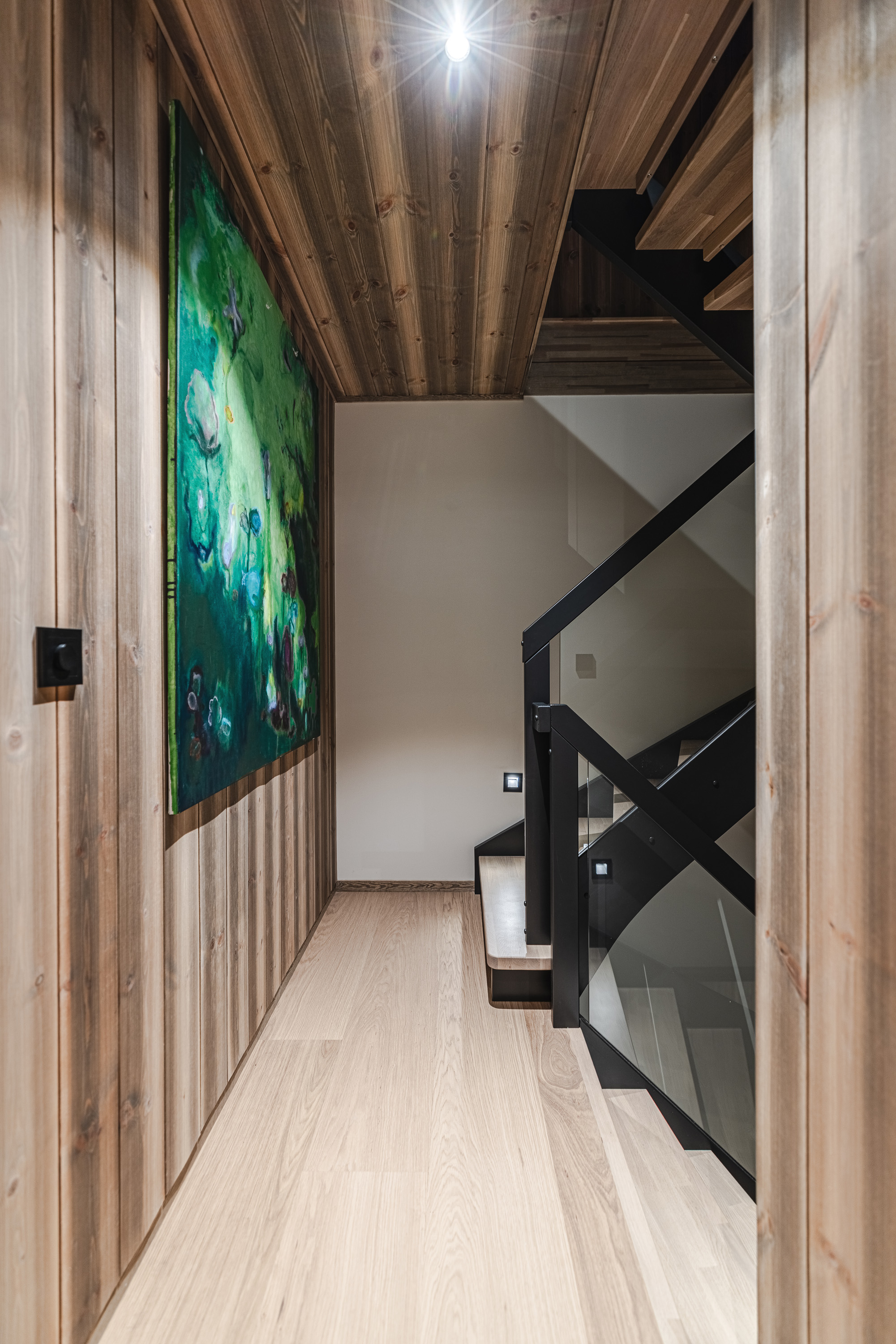 Hytta inneholder bl.a. 4 soverom, 2 bad, 2 boder, vaskerom, stor hall og parkering i garasje. Det er 3 etasjer med flere soner, og et stort oppholdsareal i den luftige toppetasjen.